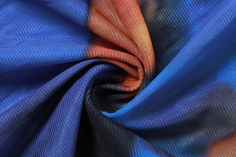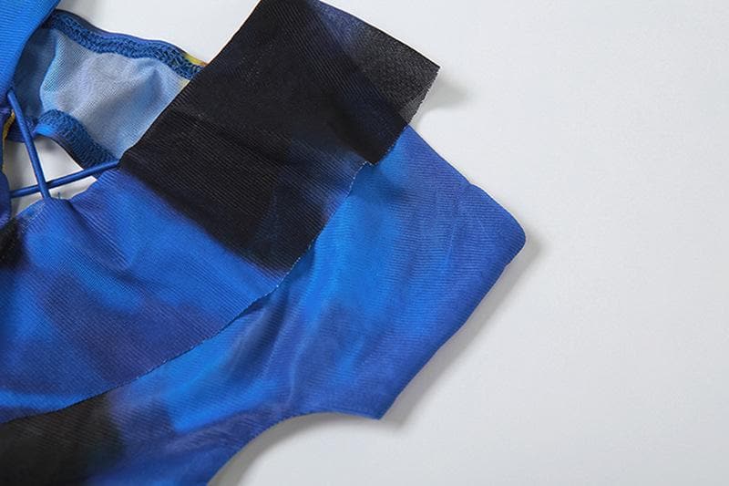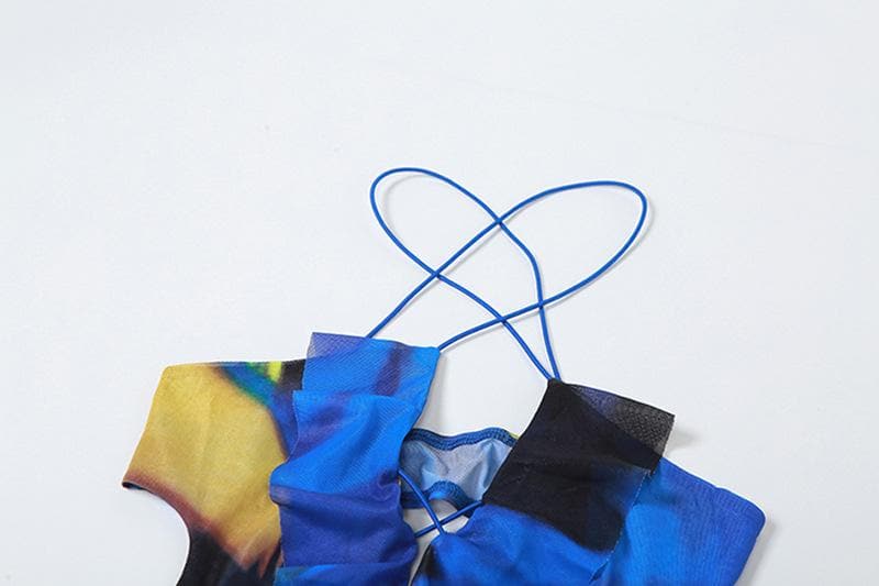 Cross front backless sheer mesh see through slit contrast print maxi dress